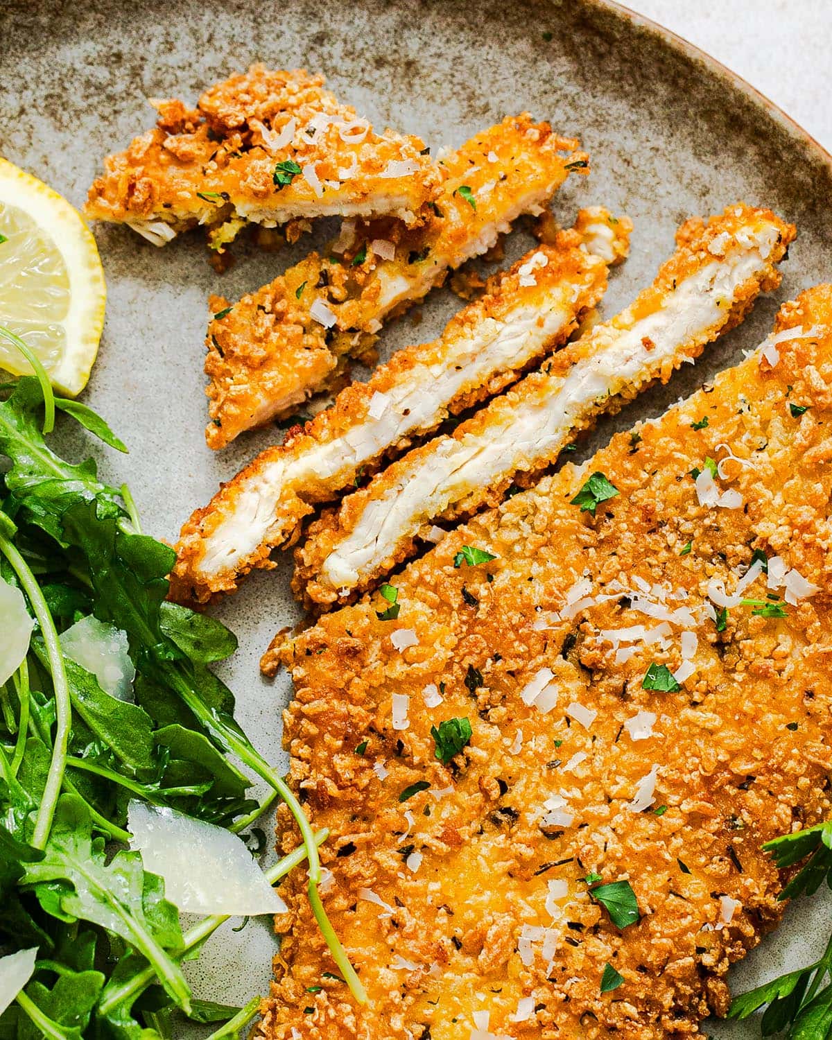 - Chicken Milanese: top crispy chicken cutlets with arugula dressed with lemon juice, extra virgin olive oil, salt, and pepper, and shaved parmesan cheese.